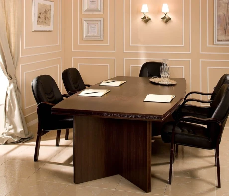 Необходимо было оснастить большой конференц-зал, кабинет директора и ресепшн мебелью в похожем стиле и цветах, но из разных ценовых категорий. Также поставлена задача подобрать соответствующие по цветам и размерам операционные тумбы и тумбы для оргтехники в оборудованные ранее кабинеты сотрудников. Важное условие заказчика – традиционный классический стиль мебели и темные цвета в деревянной фактуре.